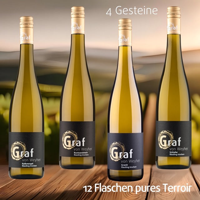 At the Graf von Weyher winery, Riesling accounts for a whopping 25% of the area under cultivation. Particularly unusual (and we're a little proud of that): we have four (!) different types of rock in this relatively small area, and that's rare! Slate, red sandstone, lime marl and granite . In this way, we can also grow four different terroir wines (or vineyard wines).